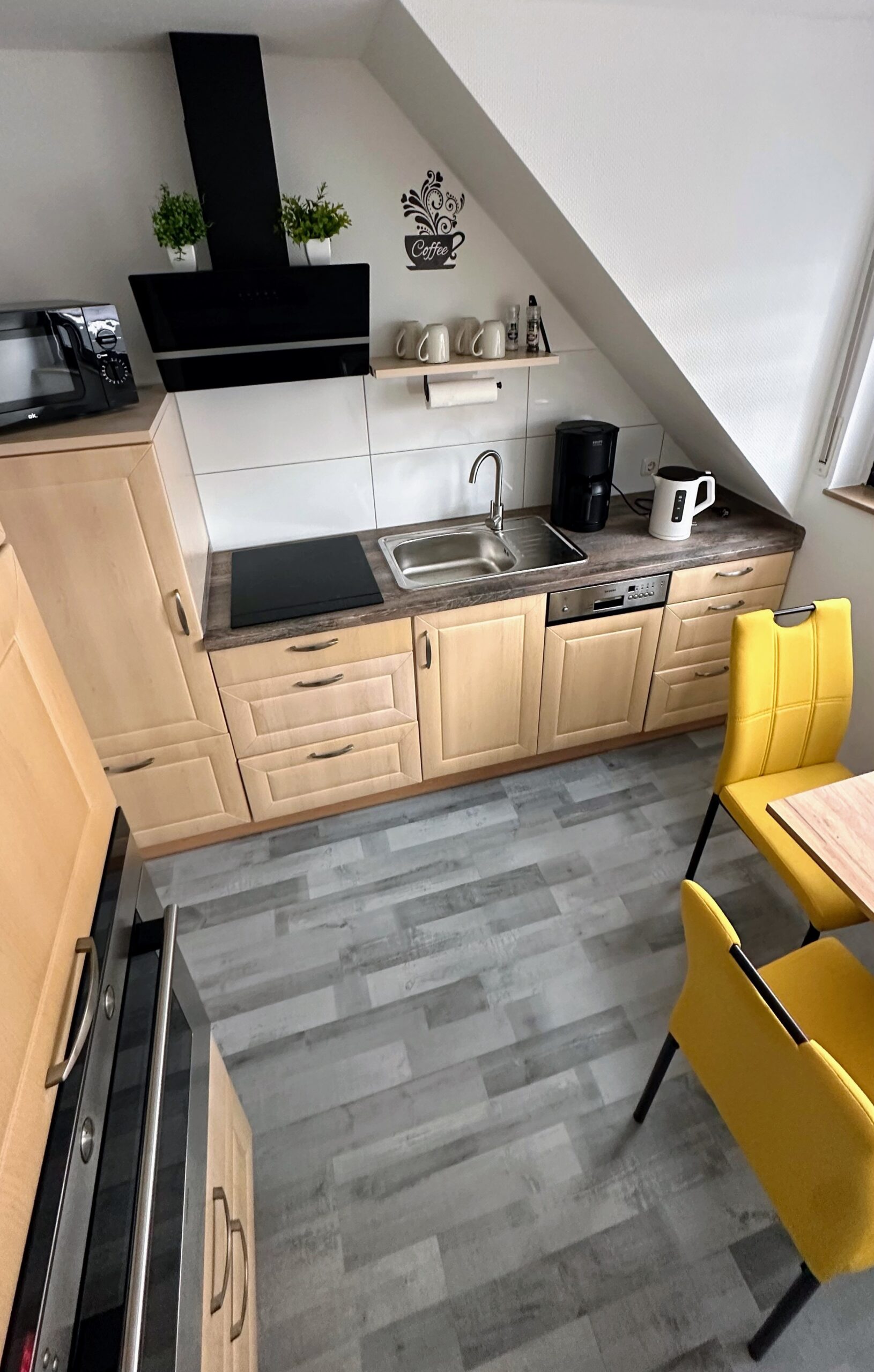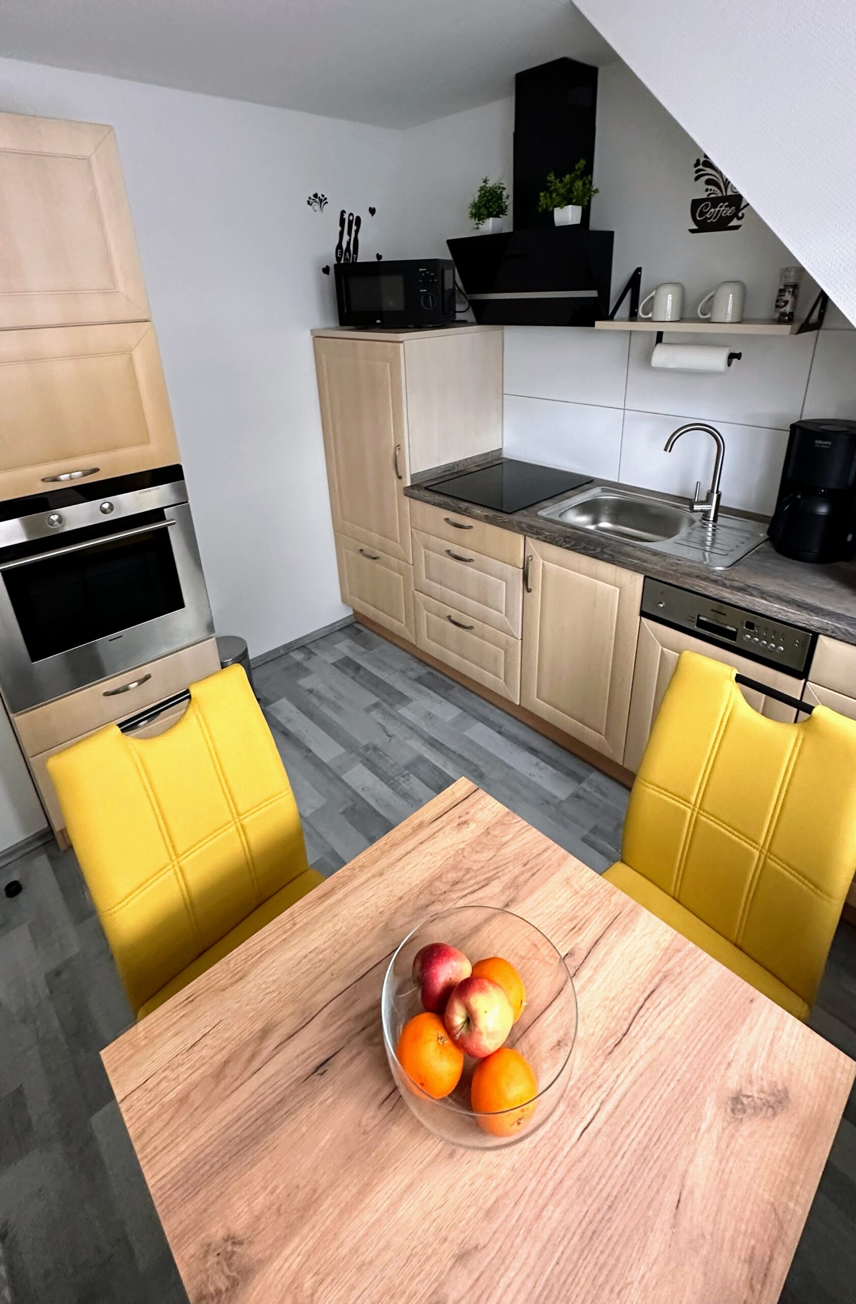 Unsere voll ausgestattete Küche bietet alles, was Sie für eine komfortable Zubereitung Ihrer Mahlzeiten benötigen. Sie finden hier einen Induktionsherd, Backofen, Kühlschrank, Mikrowelle, Spülmaschine, Filterkaffeemaschine sowie einen Wasserkocher – alles, was das Herz eines Hobbykochs begehrt. Zusätzlich stellen wir Ihnen sämtliches Geschirr, Besteck und nützliche Kochutensilien zur Verfügung. So steht einem kulinarischen Erlebnis während Ihres Aufenthalts nichts im Weg!